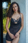 This draped slip knows exactly what it’s doing—soft, clingy, and laced with mischief. With a peek-a-boo lace cutout and sultry silhouette, it teases without trying too hard. Perfect for nights when "just one more kiss" turns into sunrise.