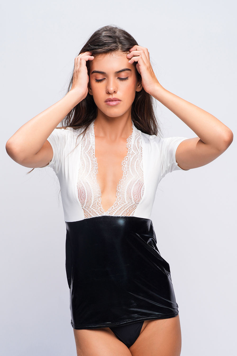 This sleek lace-detailed bodysuit brings boardroom meets bedroom energy. With a plunging neckline and curve-hugging skirt effect, it’s tailored to tease and designed to dominate those late-night memos.