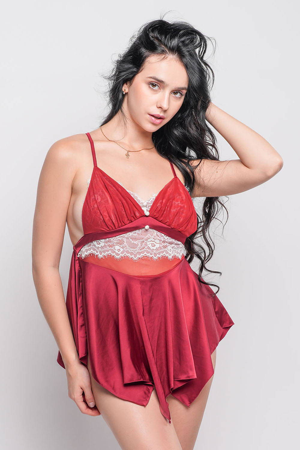 Float like a secret, flirt like a breeze. With a flared hem, sheer lace waist, and strappy back that begs to be noticed, this babydoll is made for soft twirls and stolen glances. Light, luscious, and a little bit naughty.